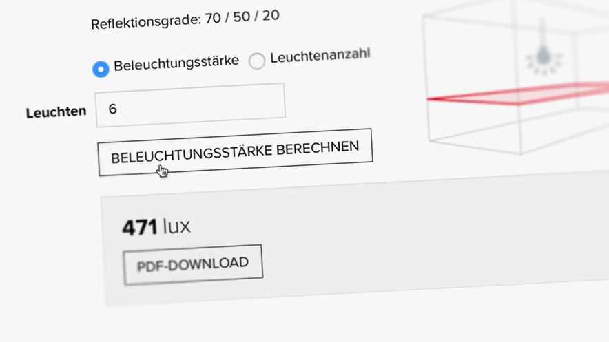 Eine schnelle Online-Lichtberechnung gibt dem Kunden nach Eingabe der Raumparameter darüber Auskunft. Im Hintergrund arbeiten dabei die Relux-Tools zur Lichtberechnung.